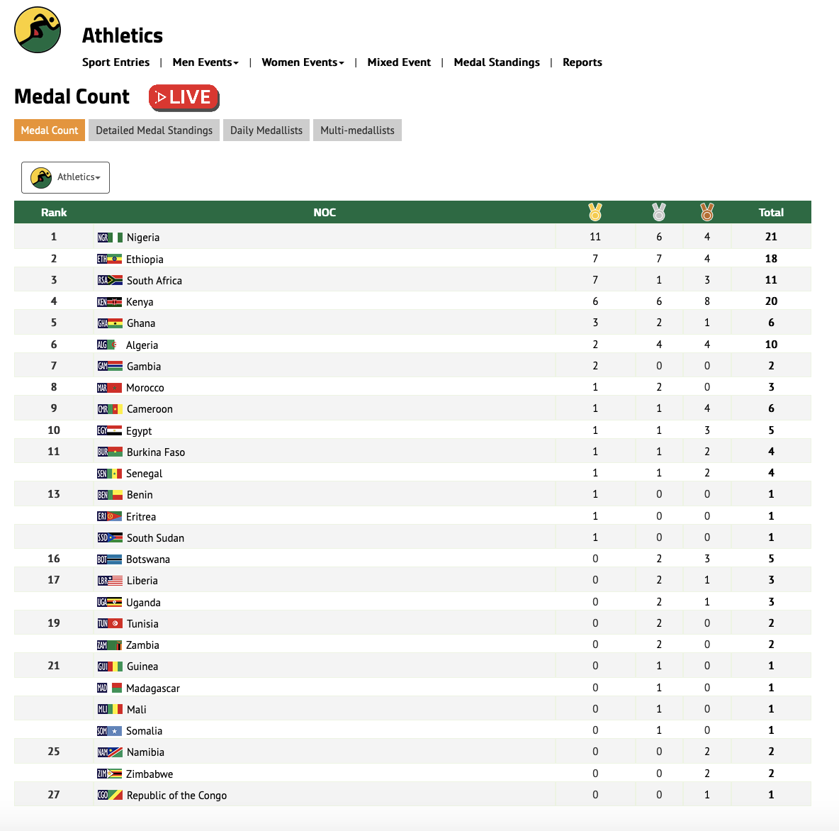 △ 非运会田径赛事奖牌榜